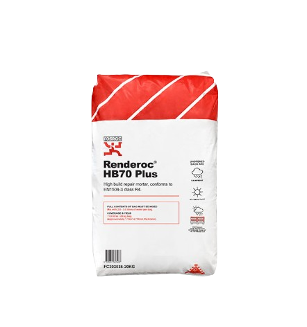 Renderoc HB70 Plus is a high strength, extra high build, shrinkage compensated repair mortar conforming to EN1504-3 Class R4